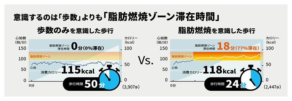 脂肪燃焼ゾーンでの「歩く」は、効率的に脂肪を燃焼します。