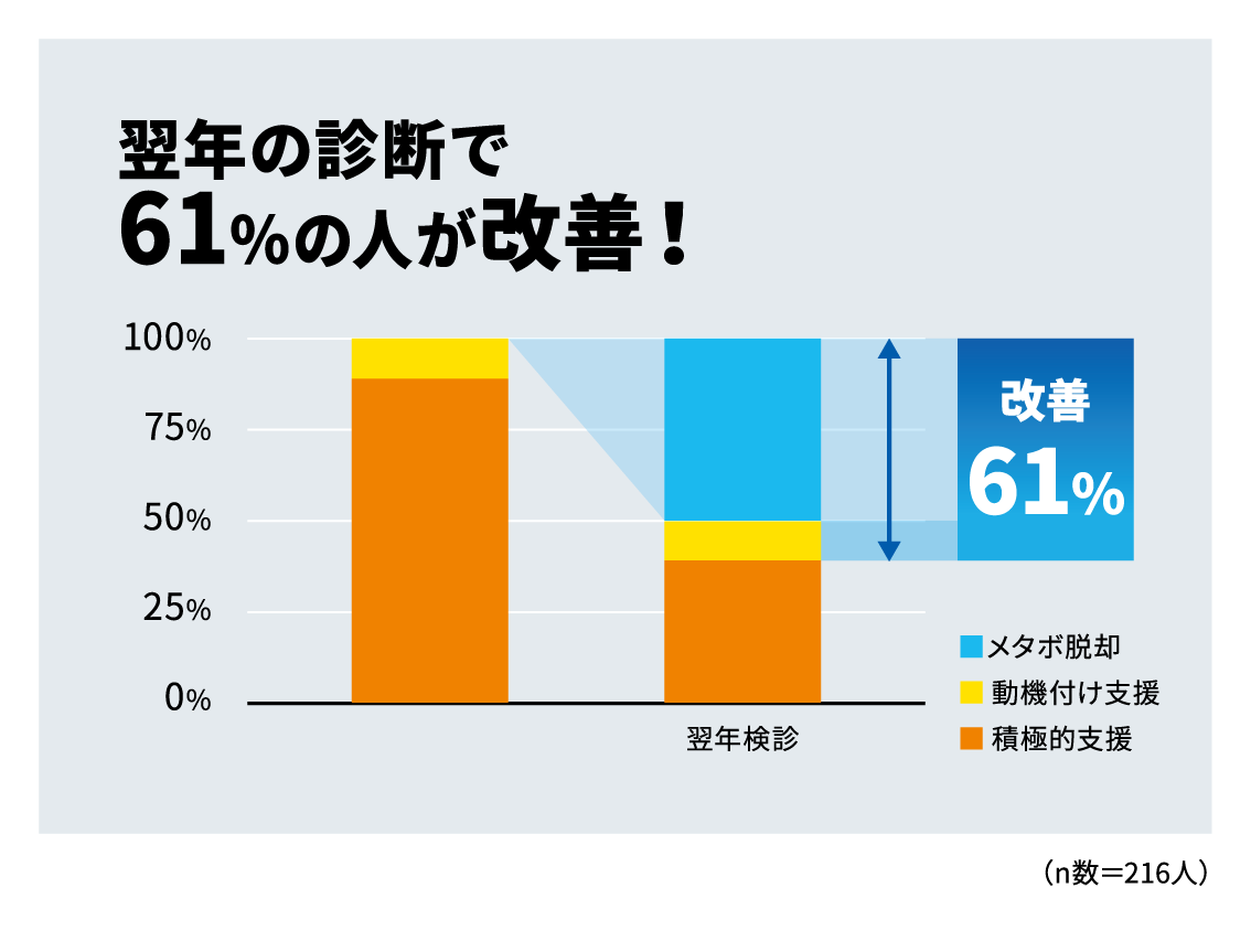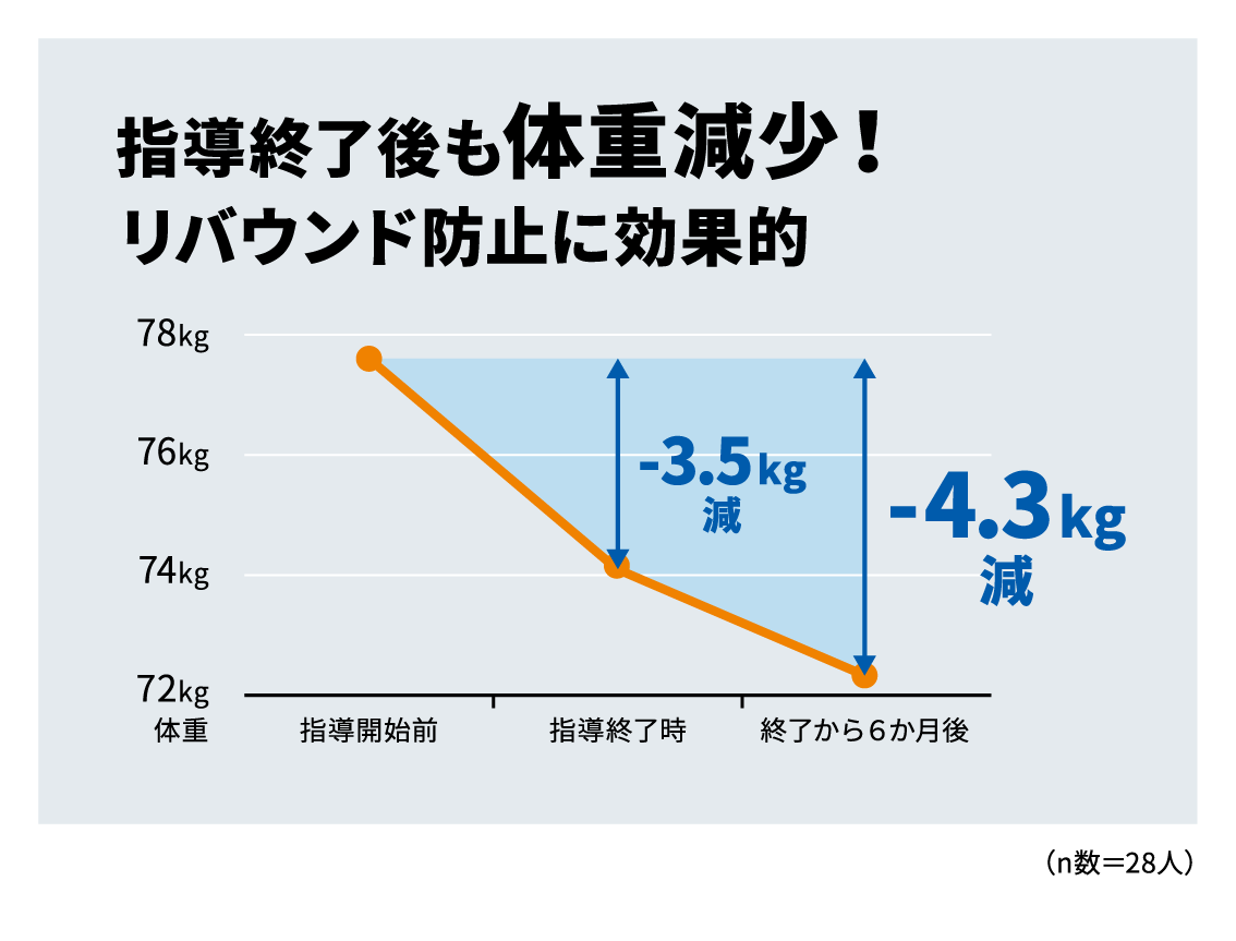 指導期間中、腹囲2㎝・体重2kg減を達成しない場合も5回支援+終了時の合計6回支援を行い、