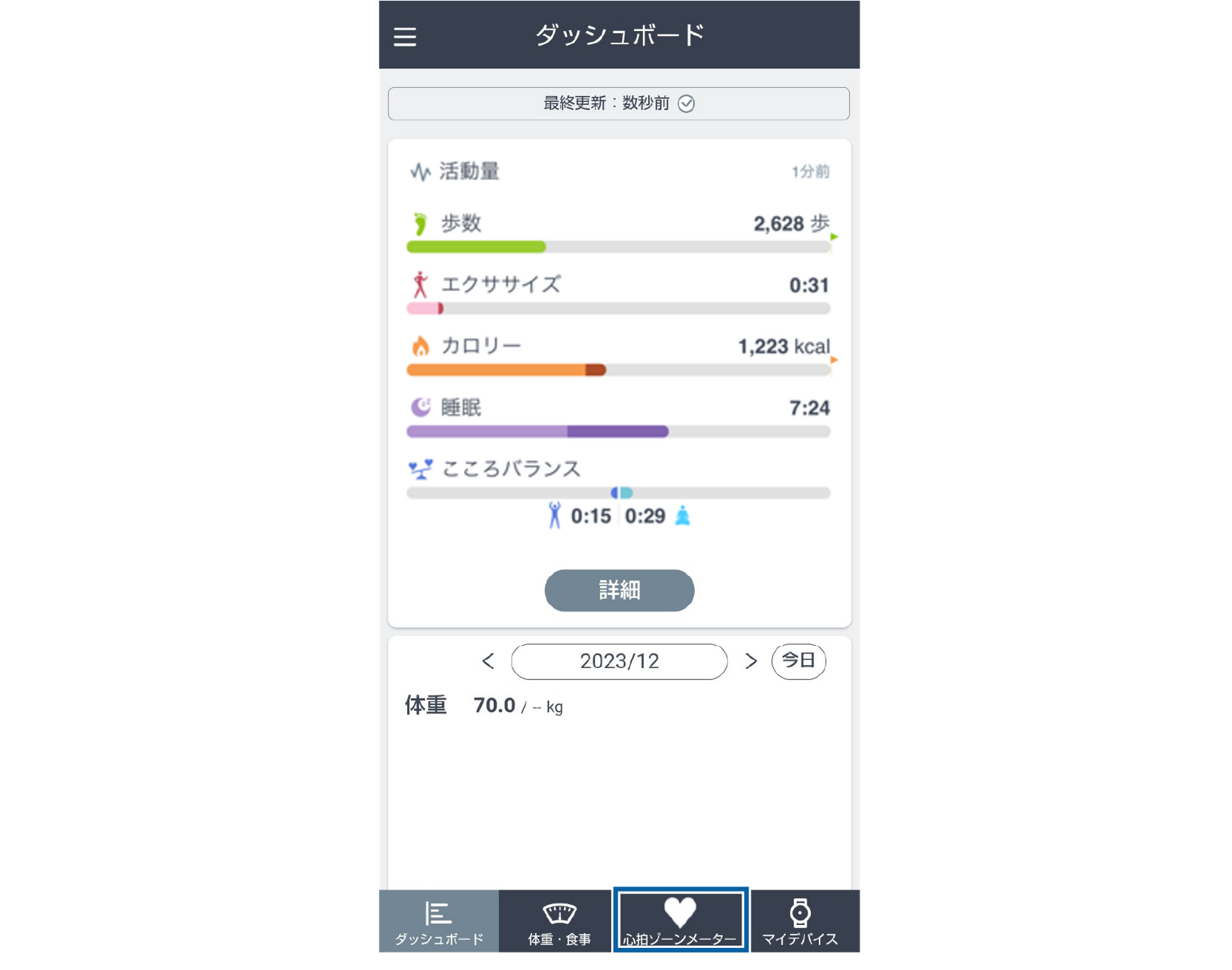 RevUpアプリのダッシュボード画面で、[心拍ゾーンメーター]をタップします。