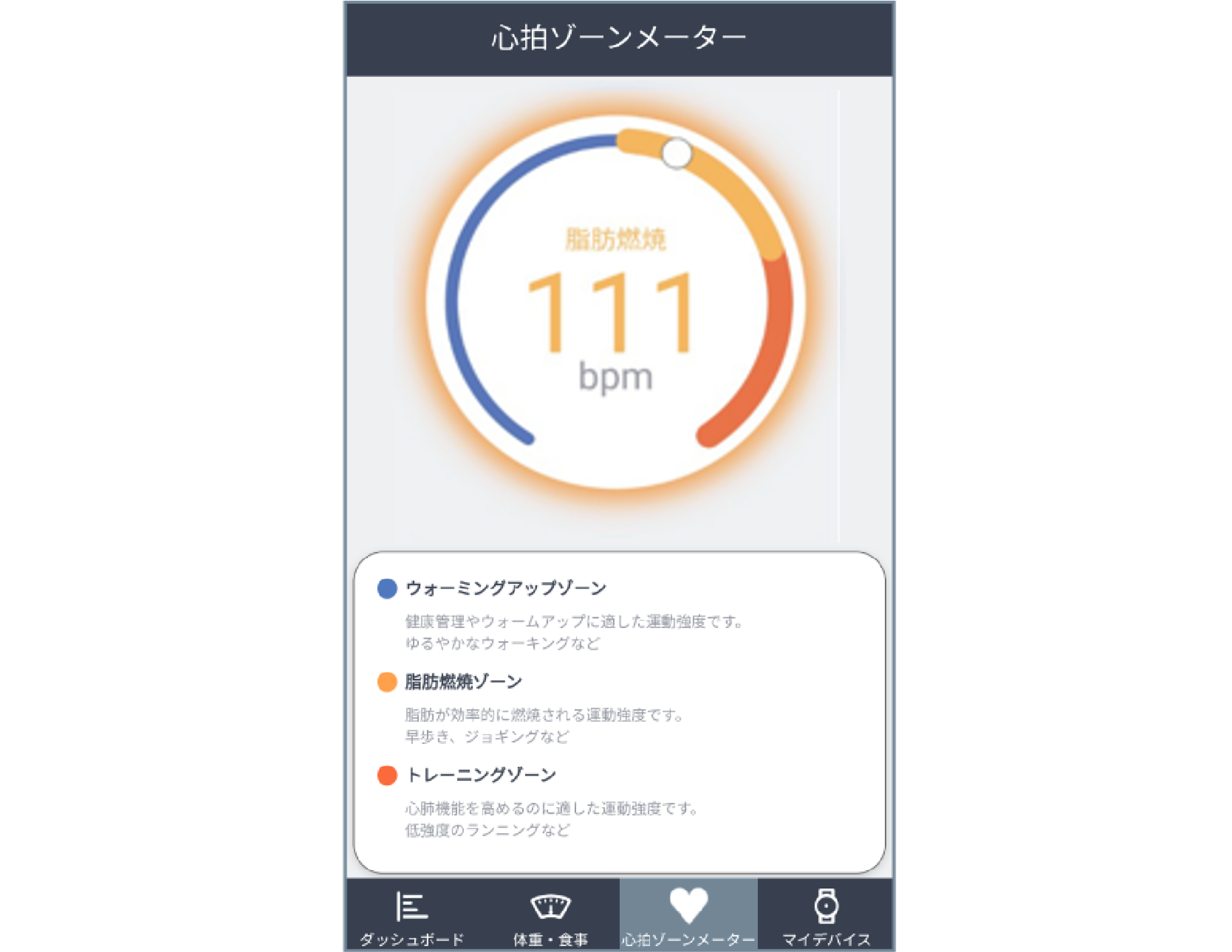 心拍数に応じて、脂肪燃焼ゾーン(メーターの黄色部分)に入っているかが分かります。