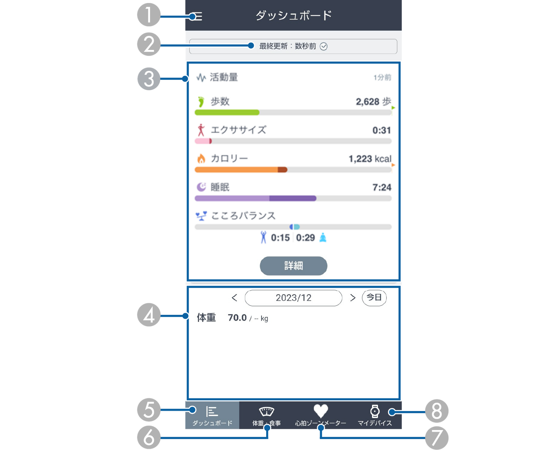 今日の歩数、エクササイズ、カロリー、睡眠の状況を表示します。計測していない項目は表示されません。 |