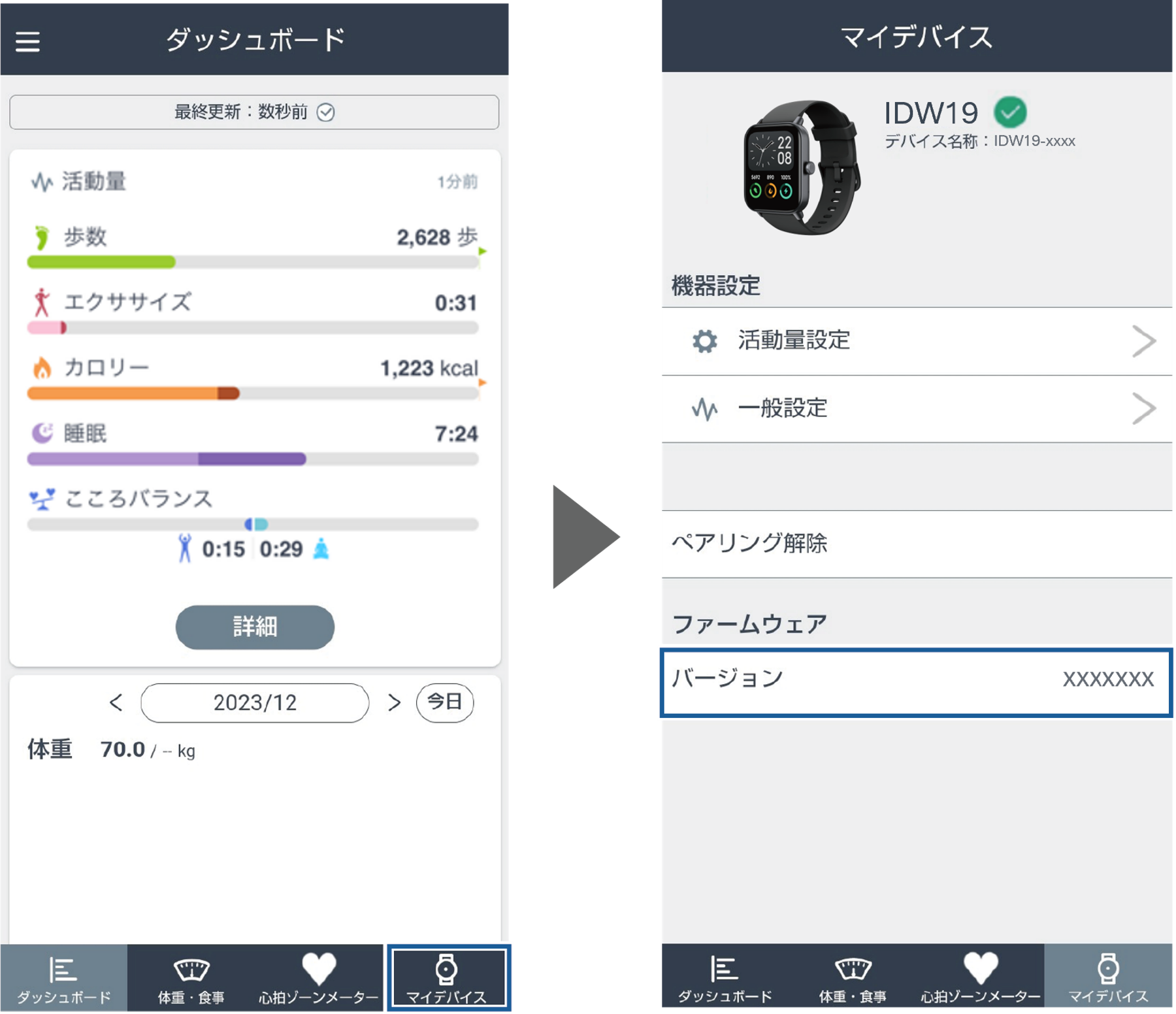 1. RevUpアプリで[マイデバイス]をタップし、マイデバイス画面でファームウェアのバージョンを確認します。