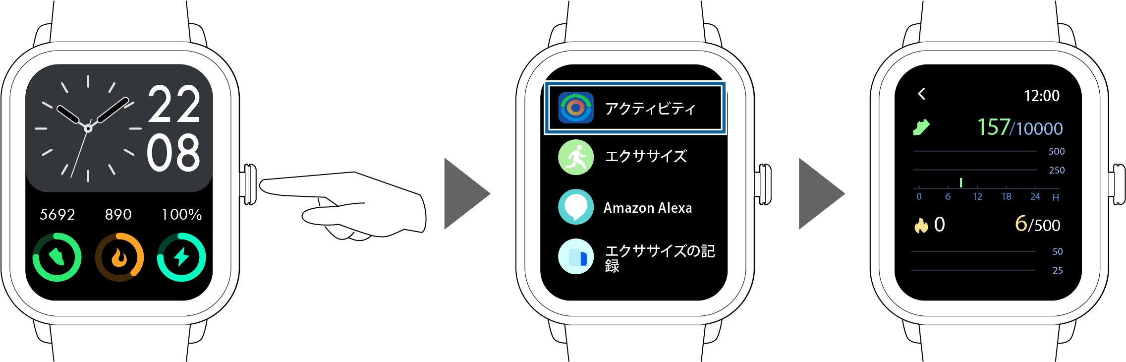 活動量計のホーム画面で機能ボタンを短押ししてメニューを表示し、[アクティビティ]をタップします。1日の歩数、距離、カロリーなどの活動データを確認できます。