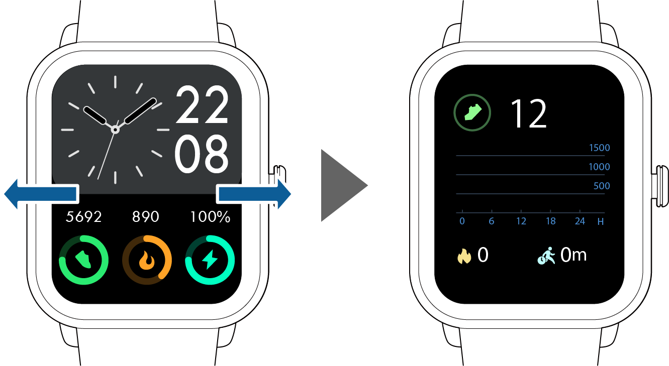 確認したいデータが見つかるまで、活動量計の画面を右または左にスワイプします。1日の歩数、距離、カロリーなどの活動データを確認できます。