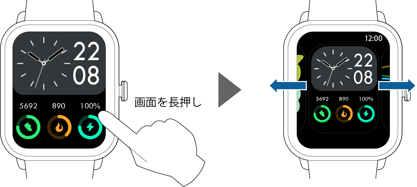 ホーム画面で画面を長押し:ウォッチフェイスの選択画面を表示します。右または左にスワイプして、変更したいウォッチフェイスをタップで選択します。