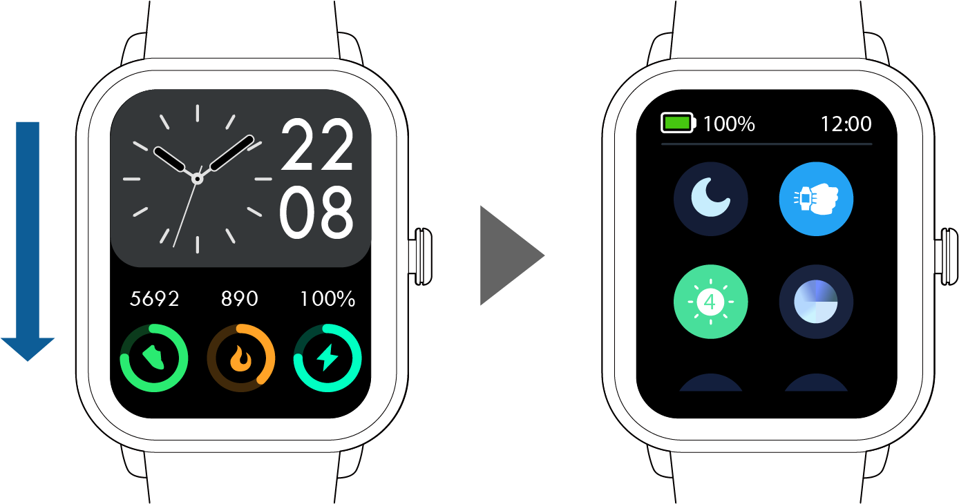 ホーム画面で下方向にスワイプ:充電残量、サイレントモード、手前に傾けてスリープ解除、明るさ設定、懐中電灯、設定などを表示します。