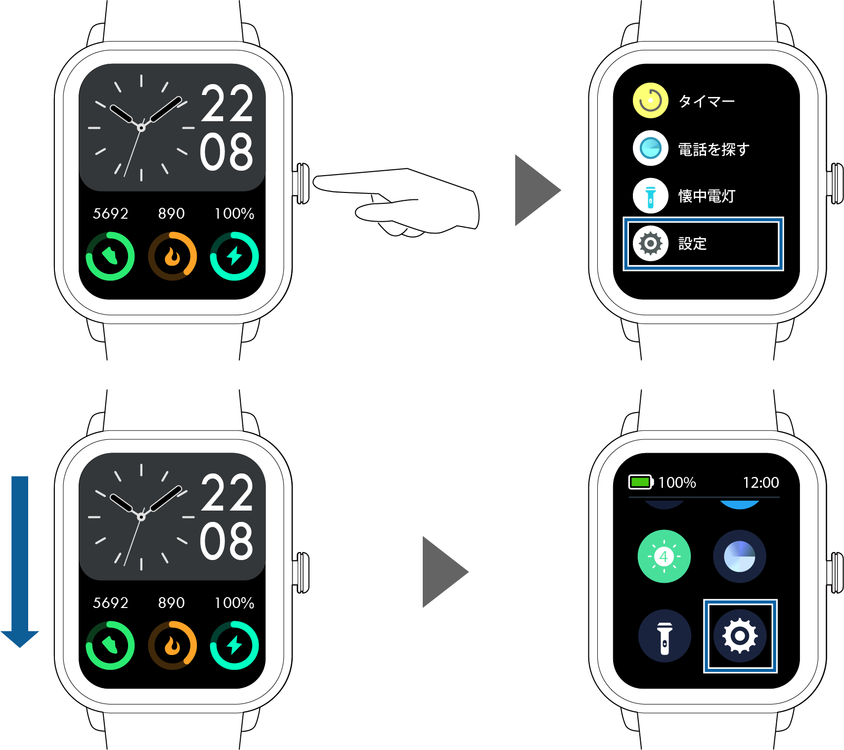 ホーム画面で機能ボタンを短押し、またはホーム画面で下方向にスワイプすると、設定メニューが表示されます。