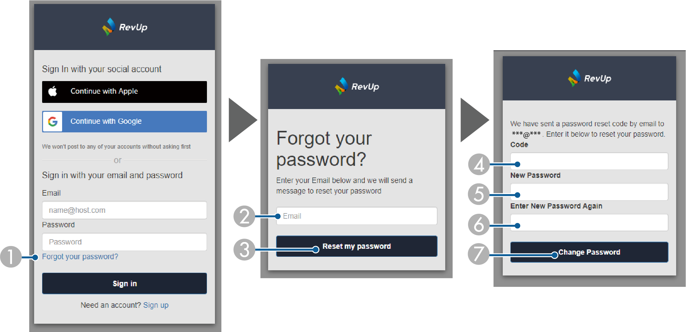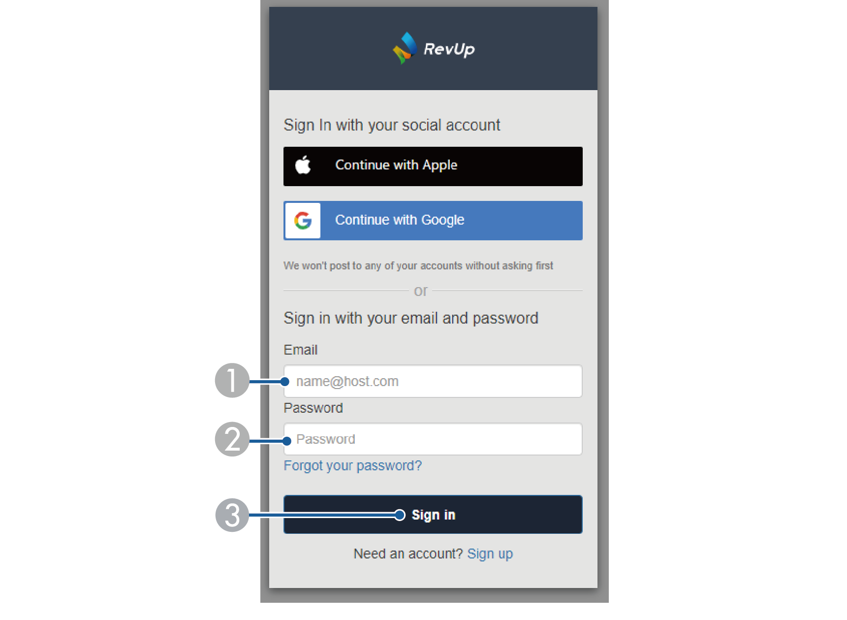:RevUpに登録済みのメールアドレスを入力します。