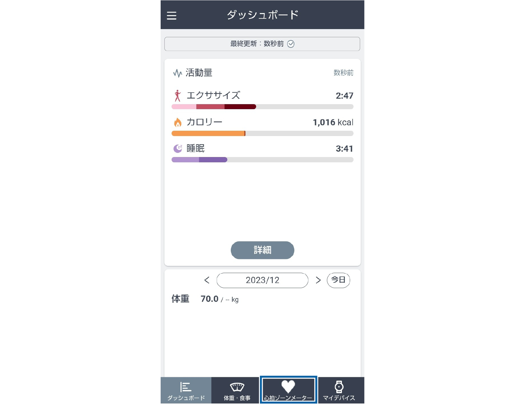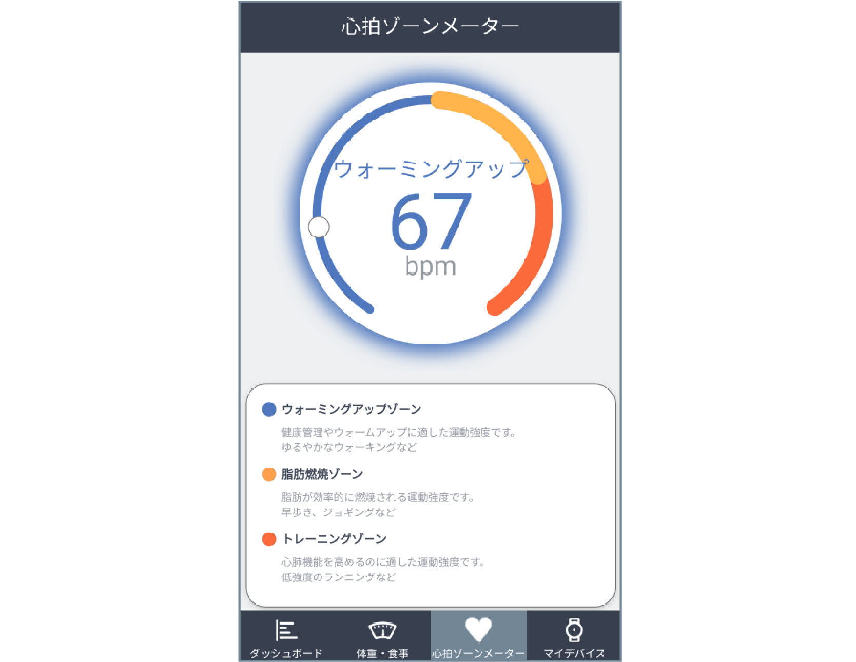 心拍数に応じて、脂肪燃焼ゾーン(メーターの黄色部分)に入っているかが分かります。