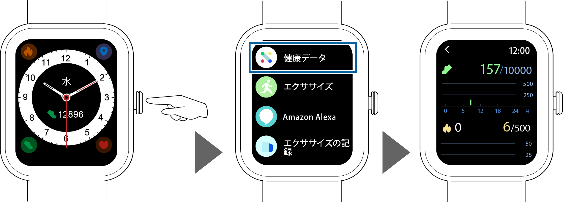 活動量計のホーム画面で機能ボタンを短押ししてメニューを表示し、[健康データ]をタップします。1日の歩数、距離、カロリーなどの活動データを確認できます。