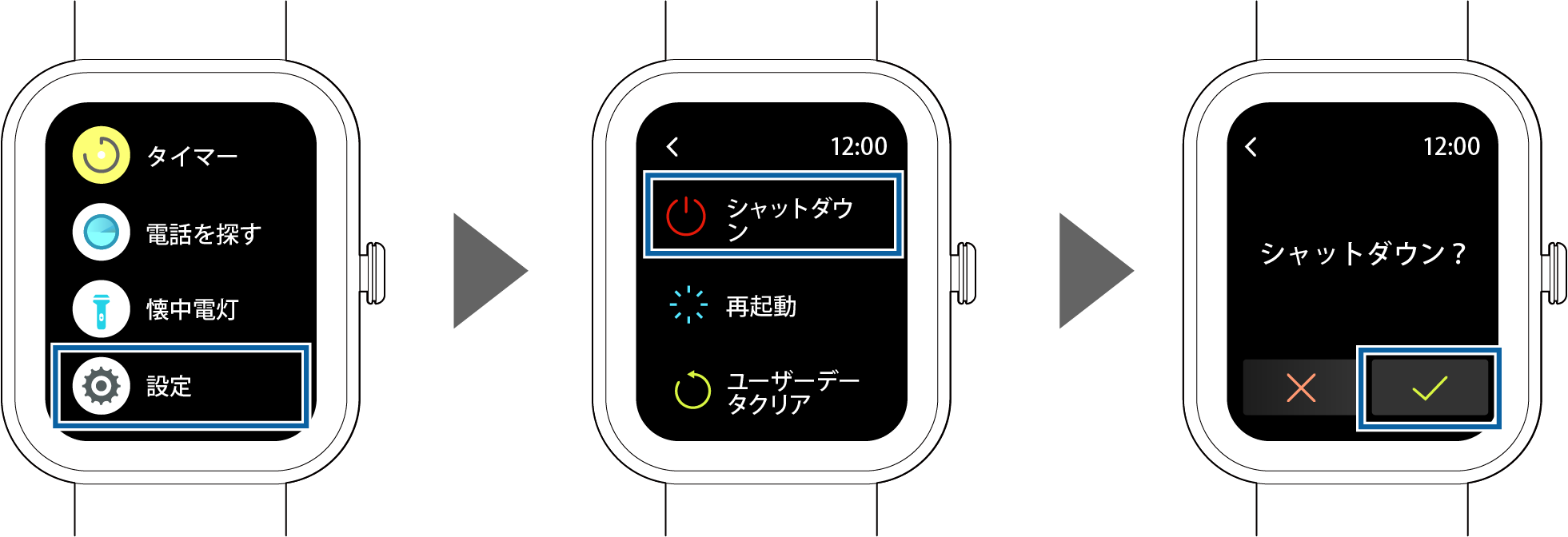 [設定] > [シャットダウン] > [✓]の順にタップして、活動量計の電源をオフにします。
