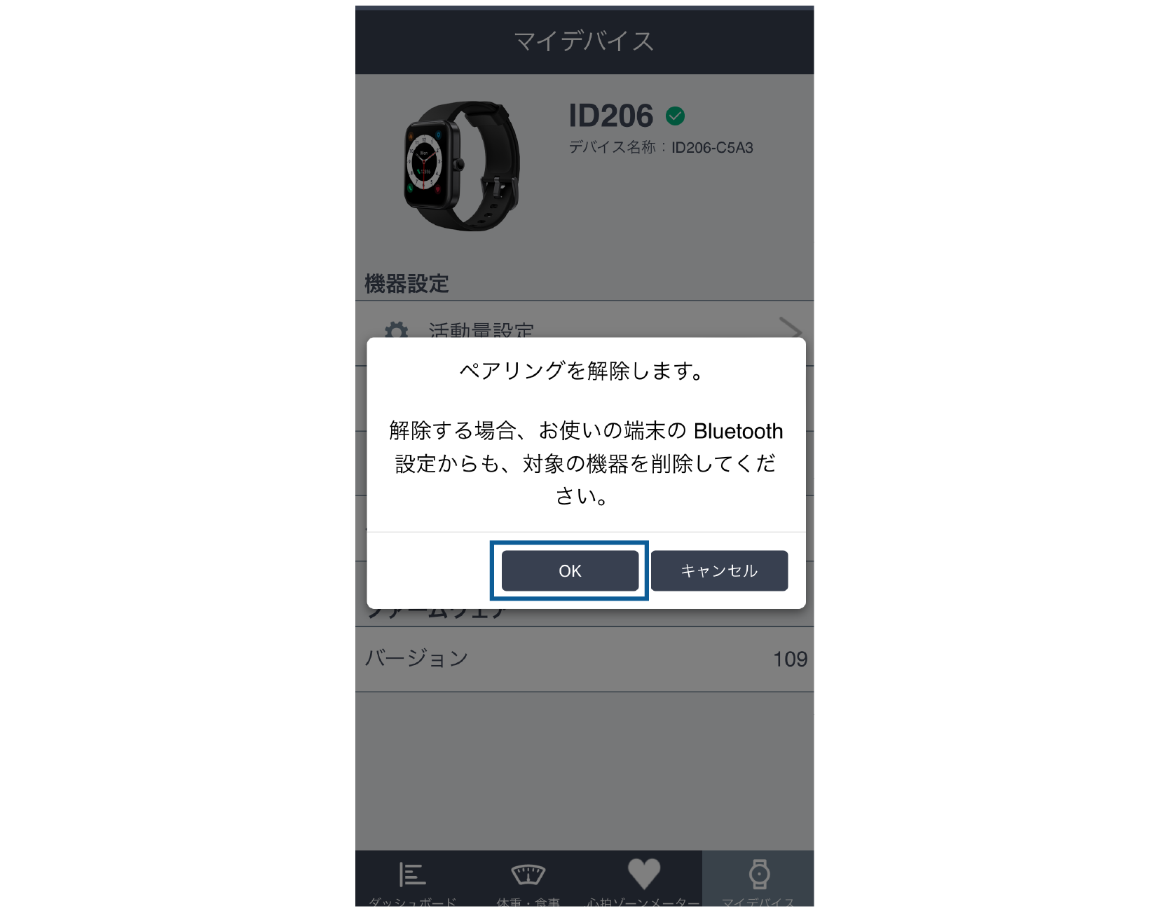 スマートフォンのBluetooth設定を開き、ペアリングされたデバイスとしてID206が表示されている場合は選択して、接続を切断します。
