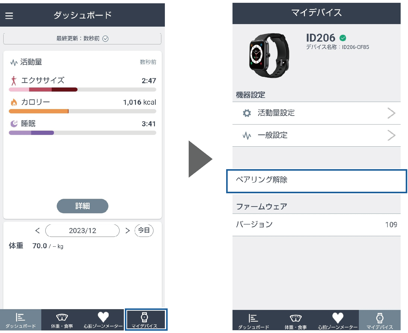 RevUpアプリのダッシュボード画面で、[マイデバイス] > [ペアリング解除]の順にタップします。